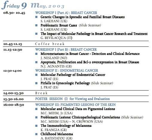 CONFERENCE 8-10 May 2003 Invitation Dear Colleagues, I am very pleased to announce you the INTRAEUROPEAN - MEDITERRANEAN CONFERENCE which will be held on May 8-10, 2003 at the beautiful Astir Palace Resort, by the sea of the suburb of Athens,Vouliagmeni. This Conference is organized by the Hellenic Division of IAP and has a tutorial character. Internationally well known experts are invited to give lectures and contribute to the success of this high level scientific event. The program is composed of 5 Workshops on 5 hot topics of Pathology, such as: Breast Cancer, Endometrial Cancer, Pigmented Lesions of the Skin, Diagnostic Molecular Pathology of solid tumors and Prostate Neoplasia. This Conference is mainly addressed to 4th or 5th year Residents and young Pathologists who need to increase their knowledge in these particular topics. I hope that our efforts to carry out this Conference will meet your expectations and this get together will be most profitable for all of us. At the end of the scientific program the members of the Board of the Hellenic Division will have the pleasure to host a Business Meeting of the Executive Committee of IAP and exchange with them ideas for a fruitful collaboration. I am sure that your participation will greatly contribute to he success of this Conference and I am wishing you to enjoy your stay with us. Looking forward to welcoming you in Vouliagmeni, Professor Niki J. Agnantis, MD, PhD, FRC Path |